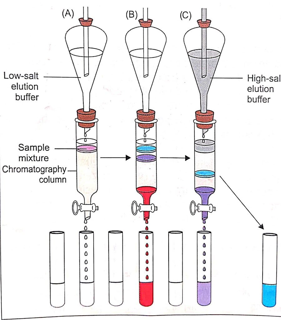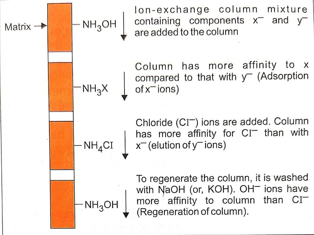 In this type of chromatography the stationary phase used is an ion-exchange chromatography resin for separation of constituents based on the number and types of charges present on the column as shown below–
