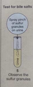 Bile salt when present on the surface tension of urine when sulfur powder is added to the surface of urine sulphur particles sink to the bottom of the test tube.
